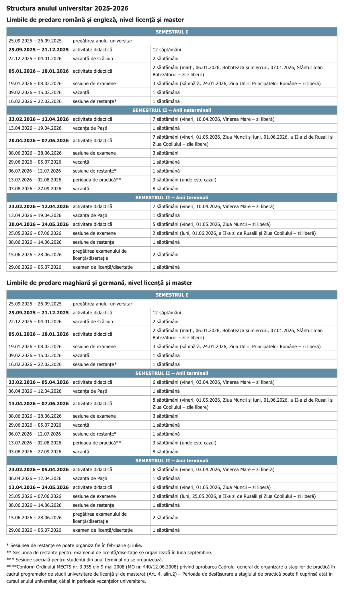 Structura anului universitar 2025-2026 – exemplu UBB Cluj-Napoca