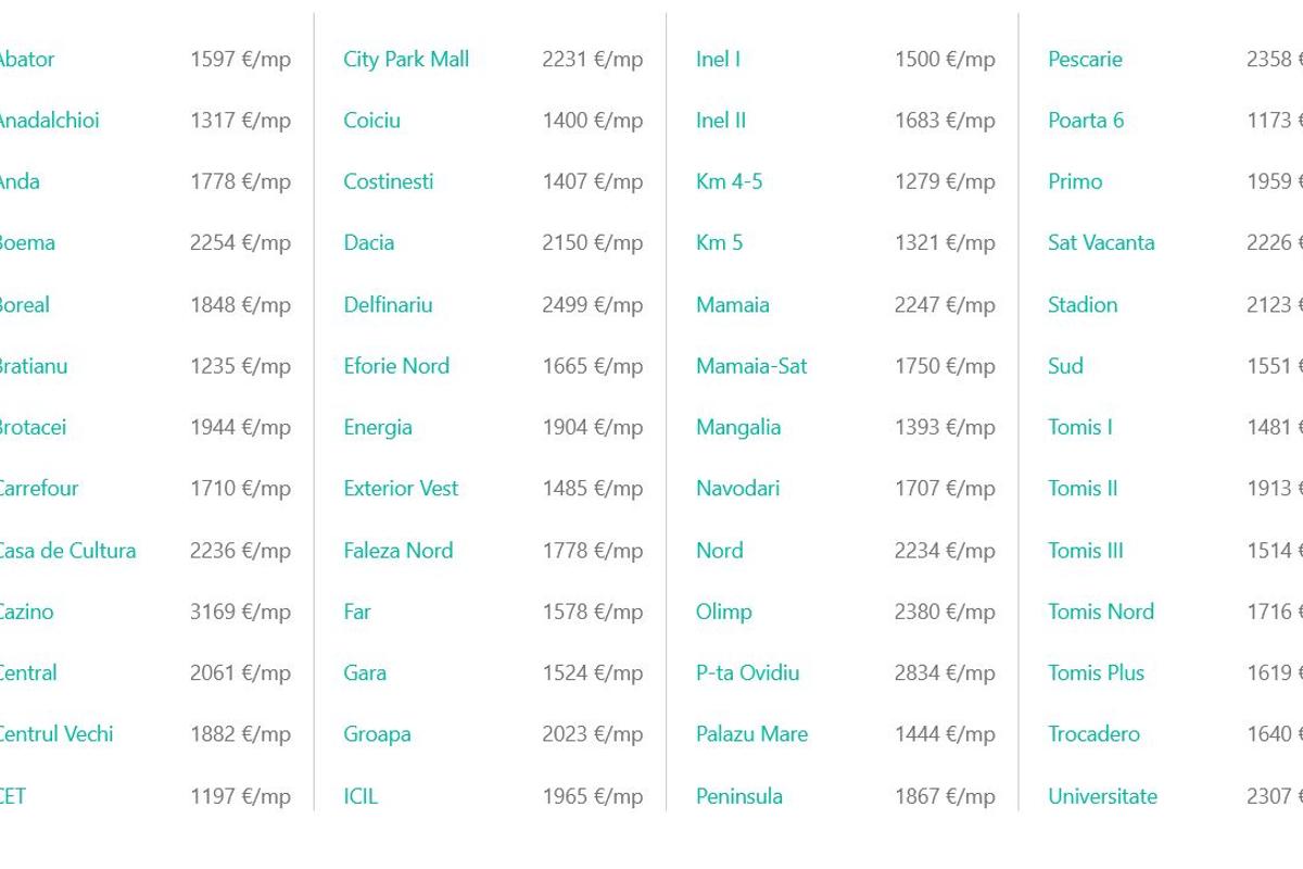- Zonele "de lux": Cele mai scumpe locații rămân City Park Mall (peste 2.230 euro/mp), urmată de stațiunea Mamaia și zona Boema.