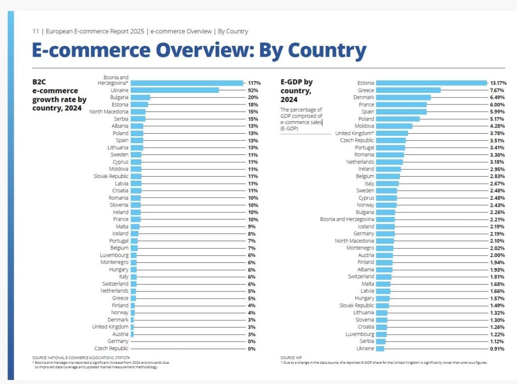 Cele mai mari creșteri pentru comerțul online la nivel european sunt consemnate în Bosnia (117%), Ucraina (92%) și Bulgaria (20%), în vreme ce ponderea cea mai mare pentru comerțul online în totalul economiei este consemnată în Estonia (13,17%), Grecia (7,67%) și Danemarca (6,49%).