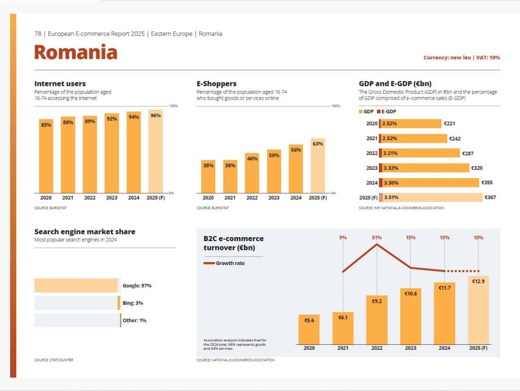 Comerțul electronic din România a depășit 3,5% din Produsul Intern Brut (PIB) în anul 2025, iar România a intrat în top zece, țara noastră clasându-se pe locul al nouălea, conform European E-Commerce Report 2025, citat de Asociația Română a Magazinelor Online (ARMO). În regiune, România este a treia, după Polonia și Cehia.