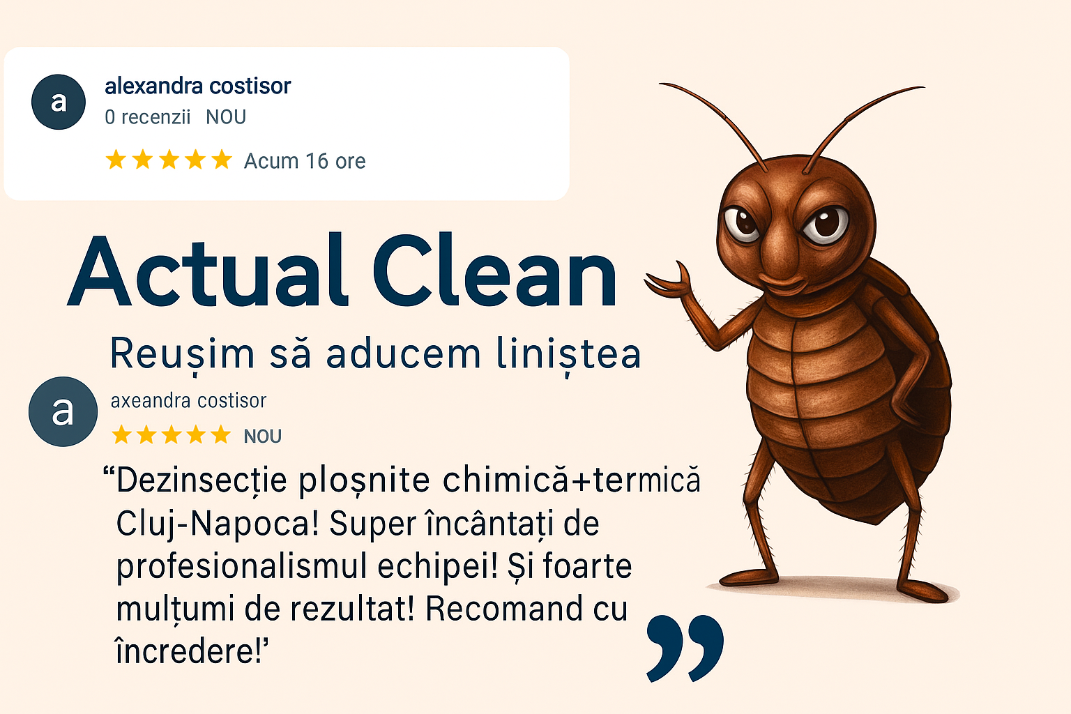 Veti optiunea de a alege Actual Clean, deoarece acestia oferă servicii profesionale de dezinsecție împotriva ploșnițelor de pat, cu rezultate dovedite și garanție inclusă. Sunt prezenți în Cluj și în întreaga regiune și tratează problema cu seriozitate, nu cu superficialitate.