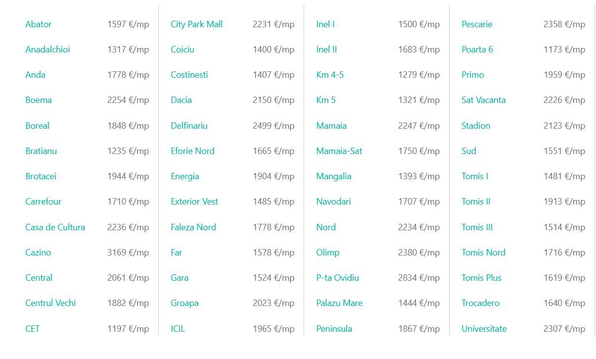 - Zonele "de lux": Cele mai scumpe locații rămân City Park Mall (peste 2.230 euro/mp), urmată de stațiunea Mamaia și zona Boema.