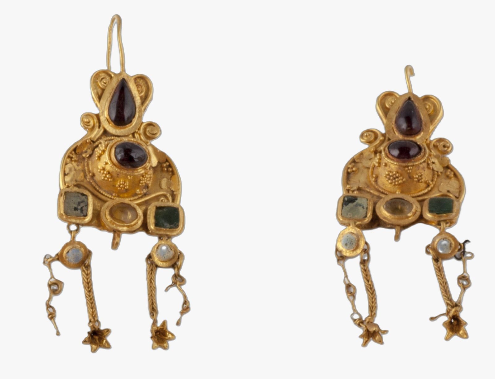 - Materiale prețioase: Decorați cu pietre scumpe și inserții de sticlă; arheologii cred că, inițial, erau împodobiți și cu perle care s-au degradat în timp.